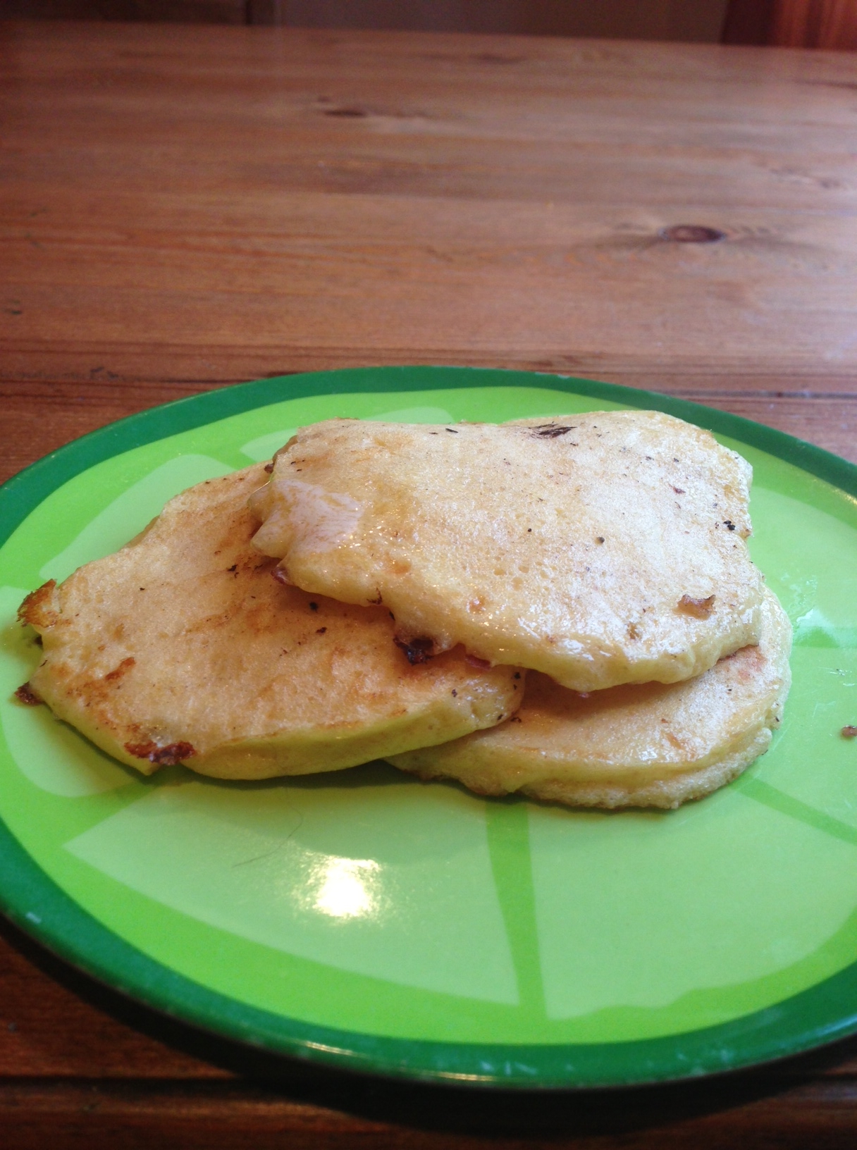 Ingredients: 2 cups flour (I like whole wheat,) 1 tsp. baking powder, 1 tsp salt, 1 tsp, baking soda, 2 eggs, 2 cups buttermilk, 1 tsp. vanilla, 1/3 cup veg. oil.