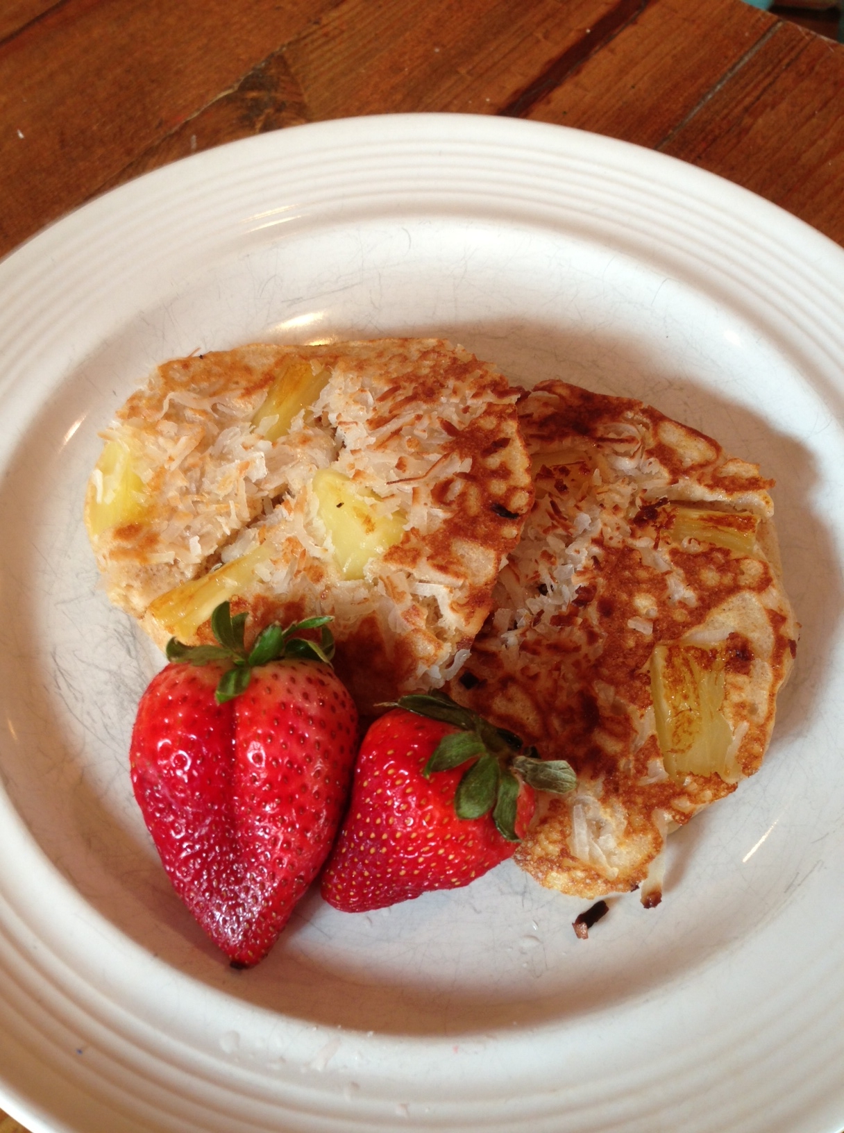 Basically I took my regular buttermilk recipe and, after pouring onto the griddle, added a few pieces of drained pineapple and a few pinches of sweetened coconut. I had to cook the pancakes on a very low heat as the pineapple’s moisture would make them doughy. I may try just mixing some crushed pineapple into the mix next time but in terms of presentation, I love the way the griddle seared the pineapple and coconut when the cakes were flipped.